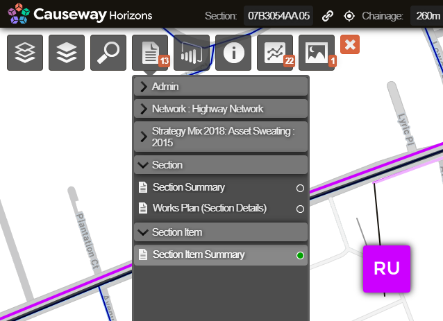 Click the top Reports icon. In the dropdown, open the Section Item folder and select Section Item Summary. This Report includes a range of information about the selected Treatment item, e.g. Section Label, Start/End Chainage, XSP Code, Description, Quantity, Cost.