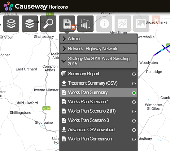 Treatment Summary (CSV) - download a CSV spreadsheet containing the data of all Treatment schemes selected by the Works Plan (e.g. Section Label, Start/End Chainage, XSP Code, Description, Quantity, Cost). This information is similar to the Treatment Summary (CSV) Report of the underlying Treatment Set, but after Strategies and Priorities have been applied. It also covers multiple financial years instead of one.