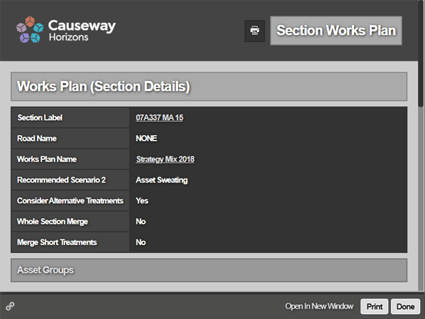 Each Report type provides extensive detail about the Works Plan in different contexts and scopes. At a Network level, you can read about each presented scenario, including the conditions monitored, the Strategies targeted and the overall costs of meeting them for each financial year. At a Section level, you can see its projected Treatments for the years ahead, and read about how Treatments were triggered, selected and merged into schemes.