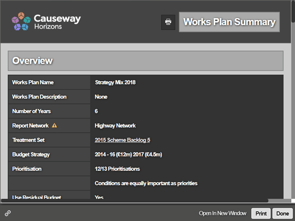 This provides key details about the Works Plan's configuration and how its results were generated. It includes the selected scenarios and their ability to meet all Strategy targets, the conditions monitored on the Network and deteriorated each year, and prioritisation details. Like all Reports, you can print and export its content for use outside of Horizons.